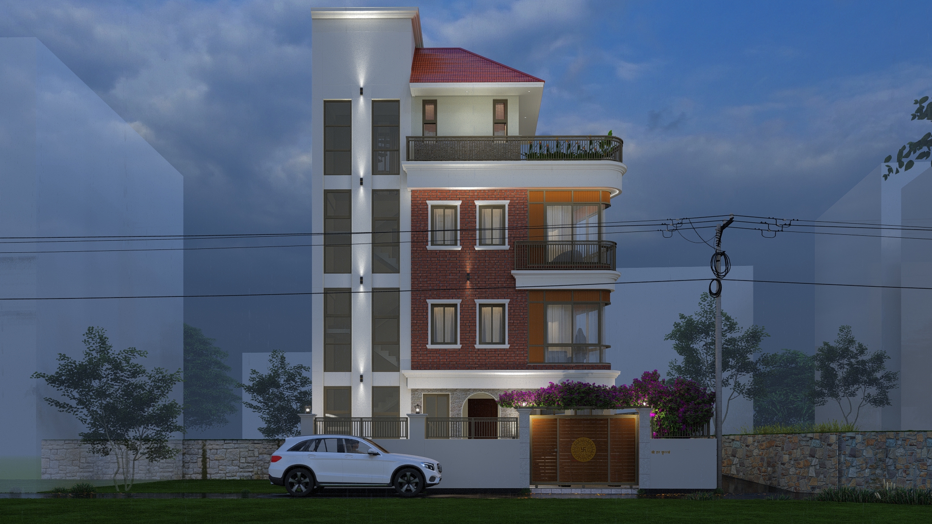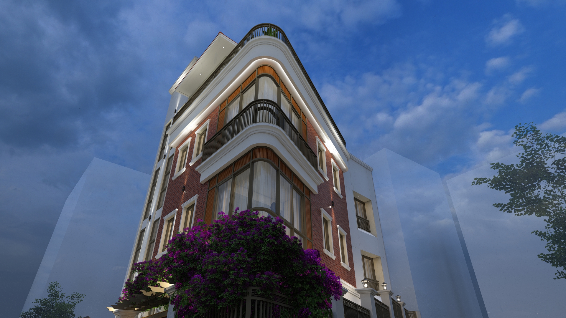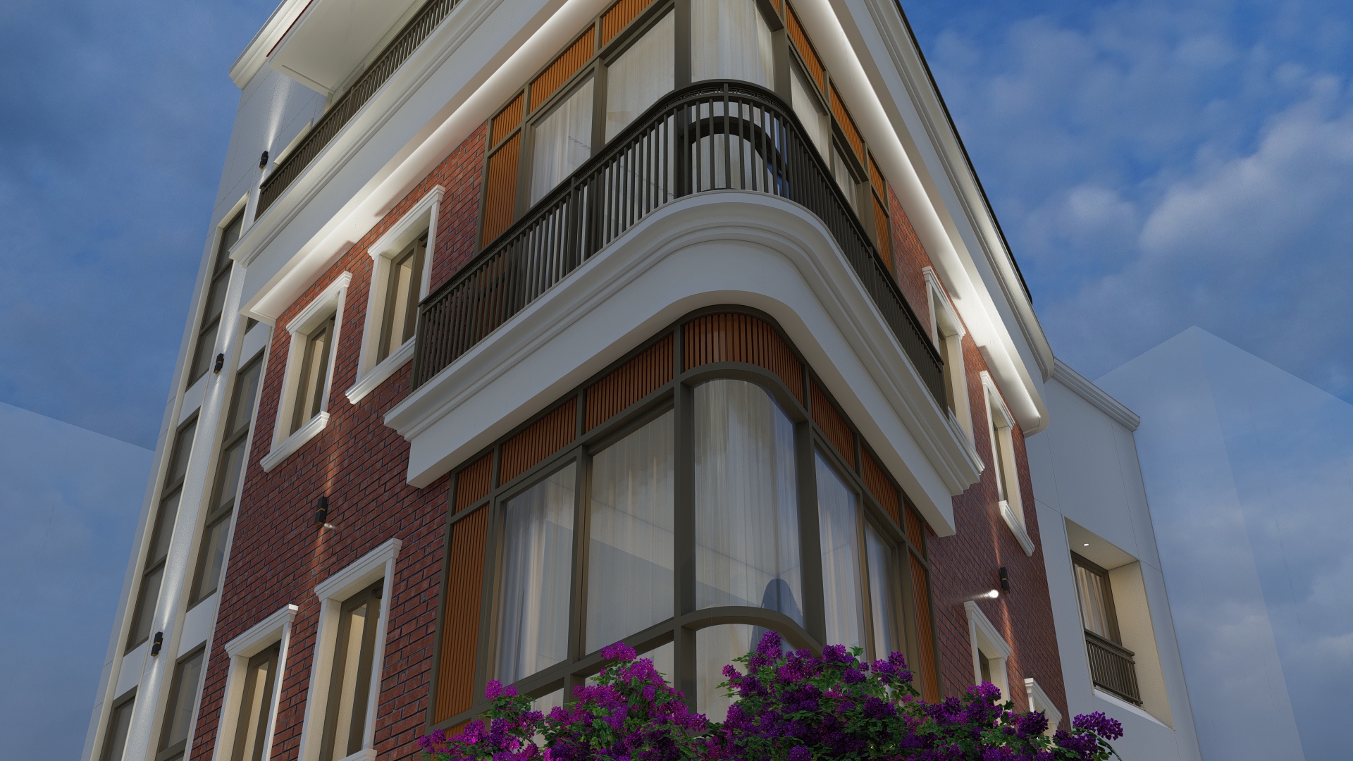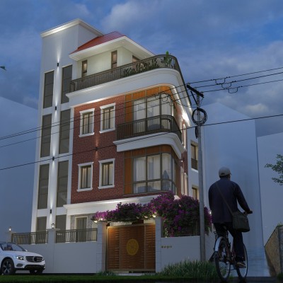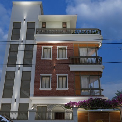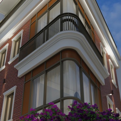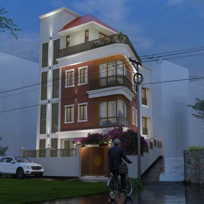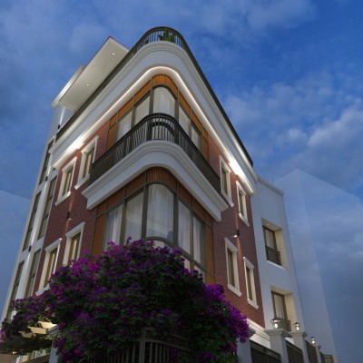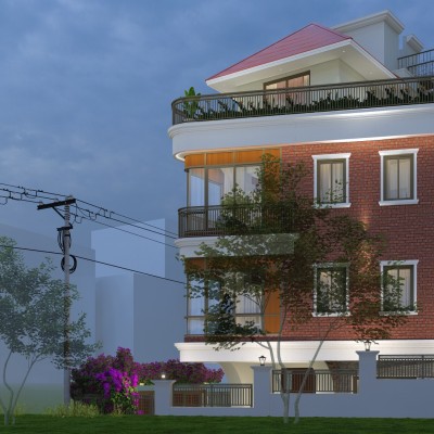 Materials : : Dachi brick tile clad, Natural stone cladding, RCC frame structure, aluminium windows, M.S railings, English cornics bands and motifs, tile cladding