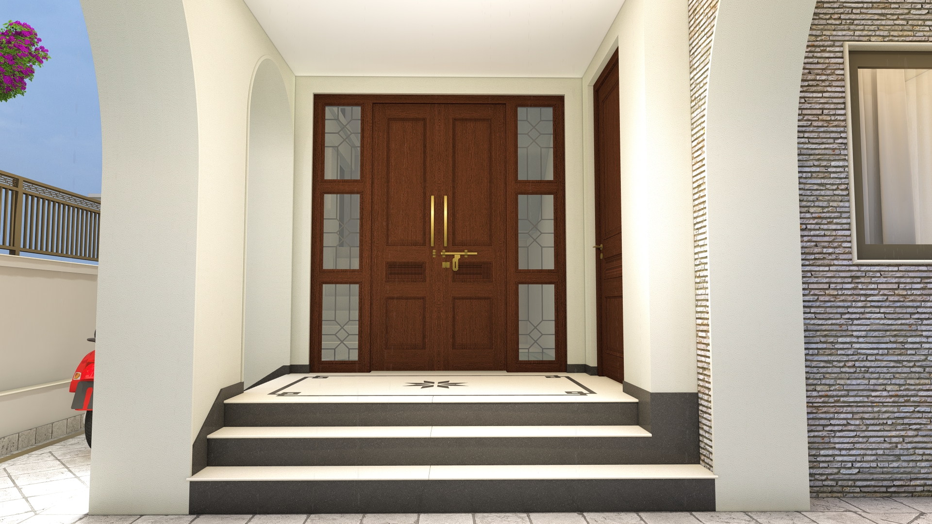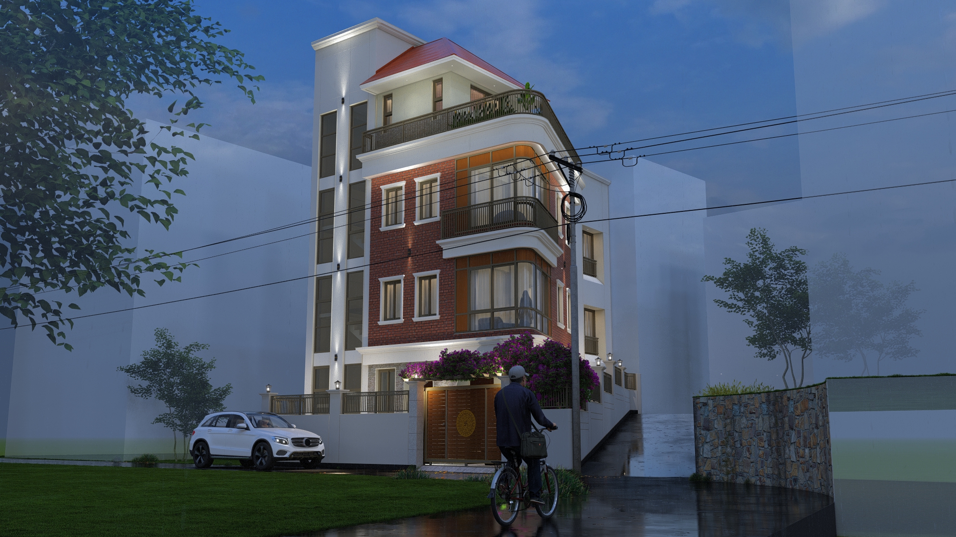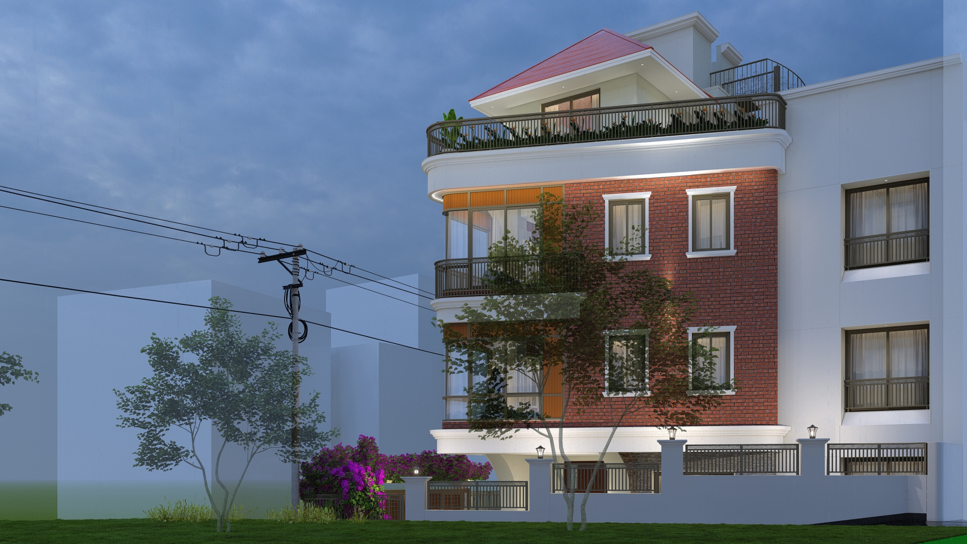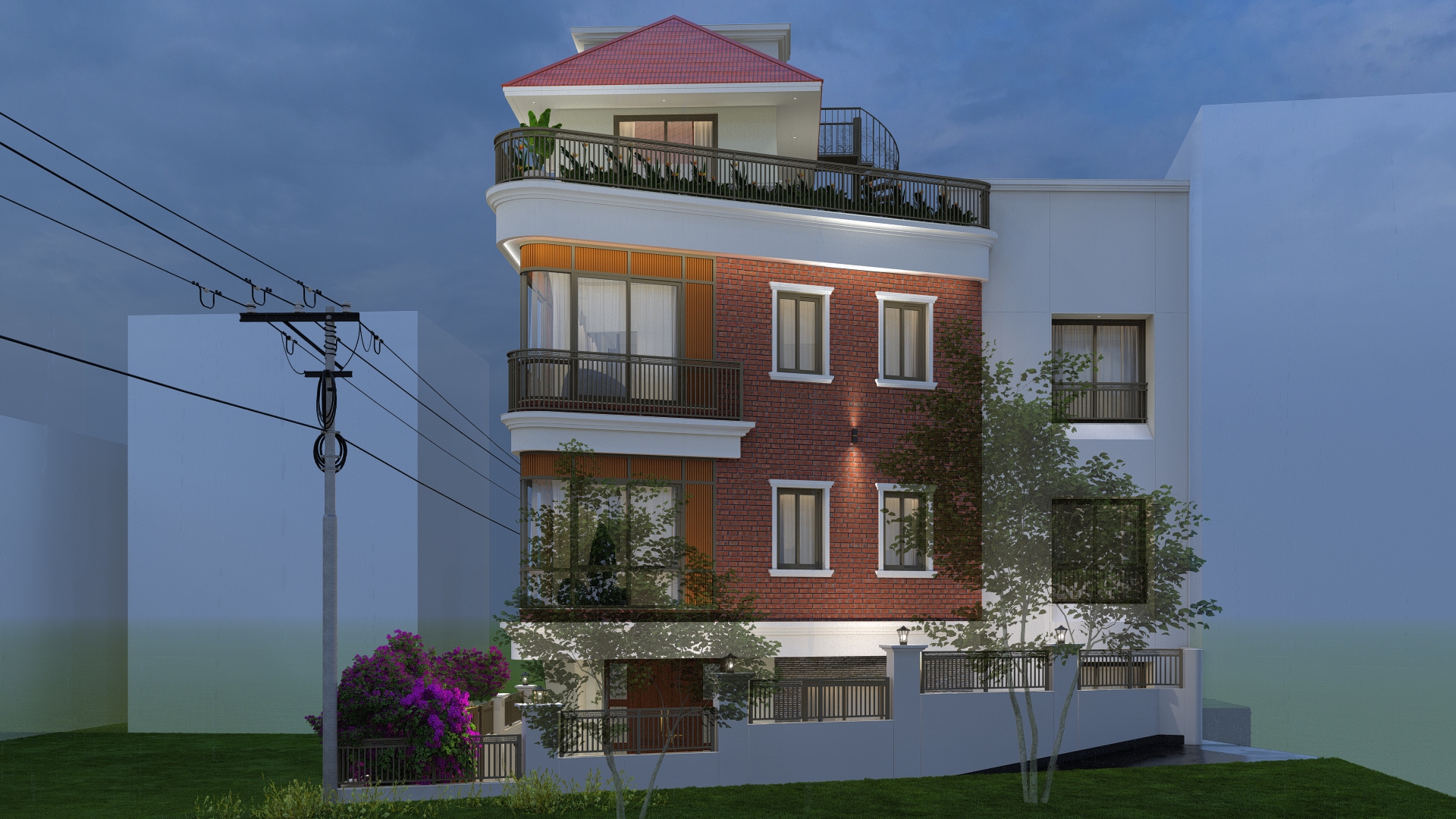 Materials : : Dachi brick tile clad, Natural stone cladding, RCC frame structure, aluminium windows, M.S railings, English cornics bands and motifs, tile cladding