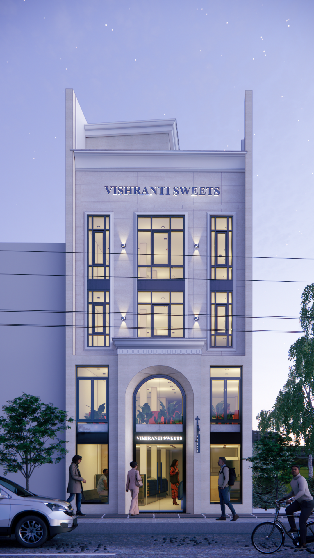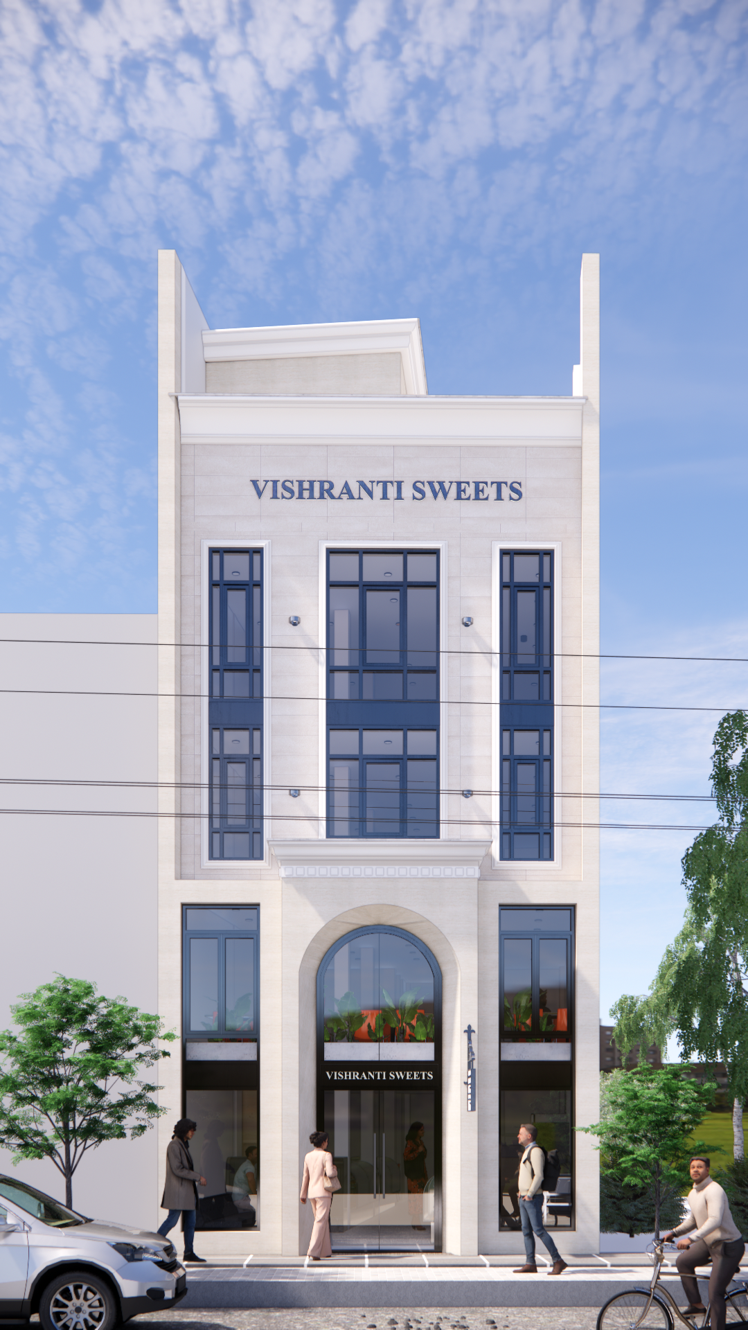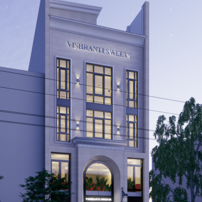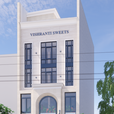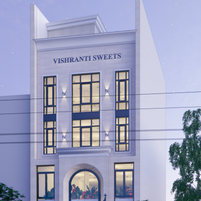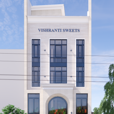 Located at the bustling heart of Maitidevi Chowk, Bishranti Sweets is a 3,800 sq. ft. commercial project designed in the vibrant spirit of Post-Modern Architecture. Set on an 800 sq. ft. site, the design reflects bold aesthetics and functional efficiency, perfectly suited for a high-traffic urban retail space.