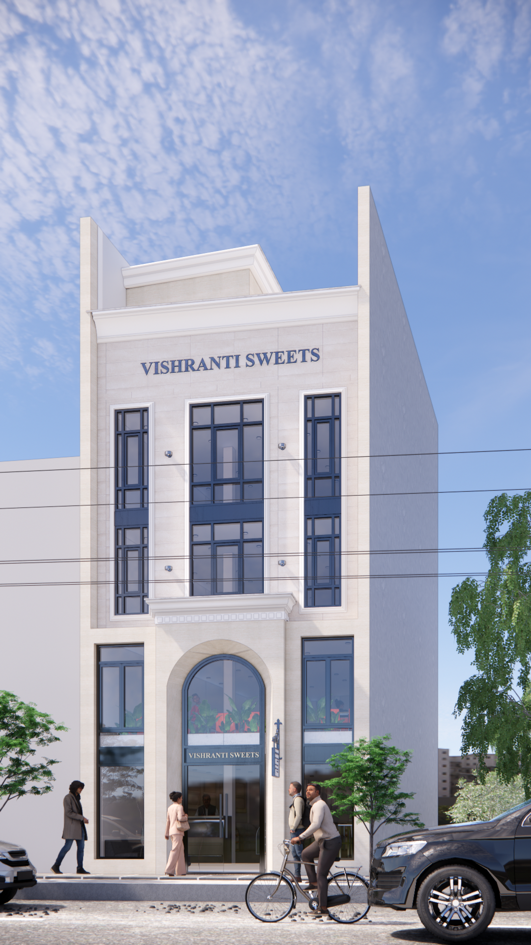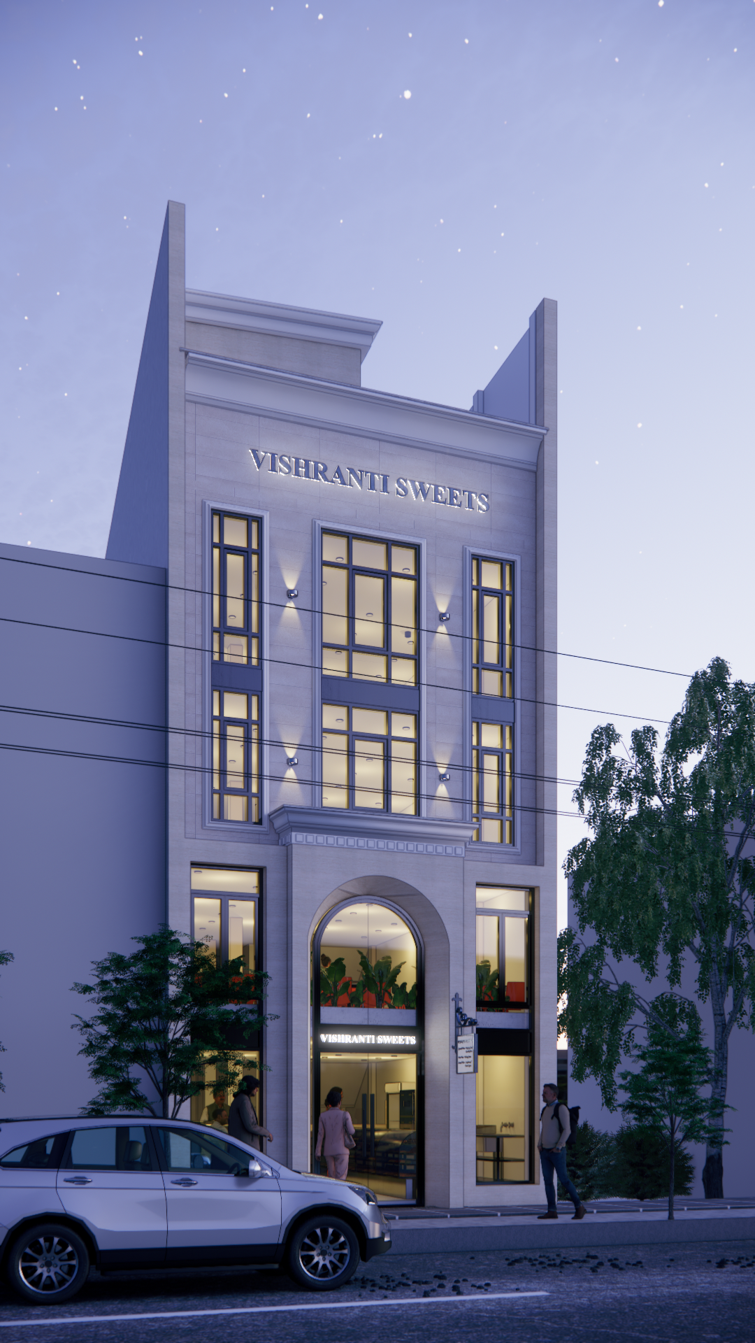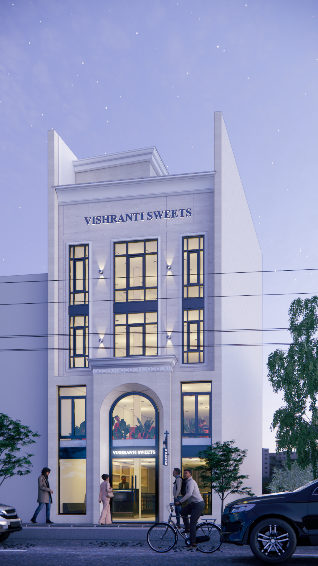 Located at the bustling heart of Maitidevi Chowk, Bishranti Sweets is a 3,800 sq. ft. commercial project designed in the vibrant spirit of Post-Modern Architecture. Set on an 800 sq. ft. site, the design reflects bold aesthetics and functional efficiency, perfectly suited for a high-traffic urban retail space.